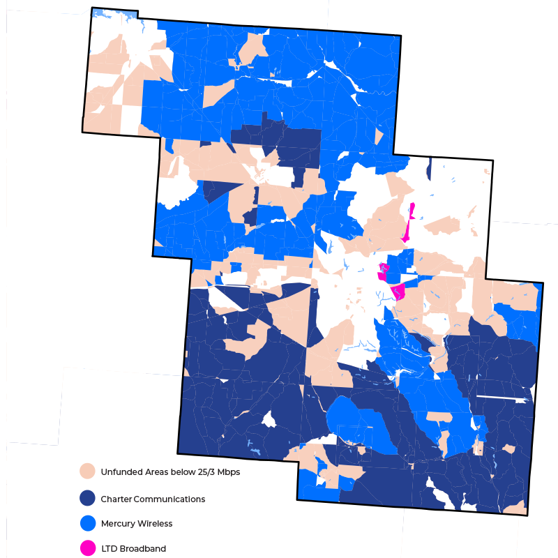 Awards for broadband infrastructure have been announced from federal, state, and private agencies. The maps below illustrate areas within the county that have been awarded funds. *awards are tentative, due to the vetting and certification process of some agencies which could result in some projects not reaching completion or funding reductions.